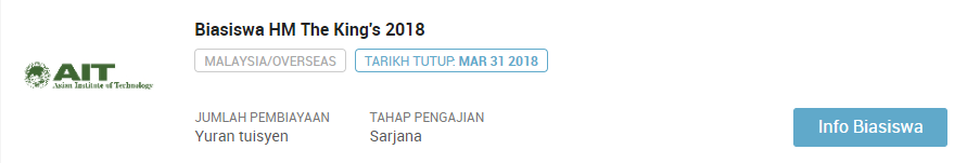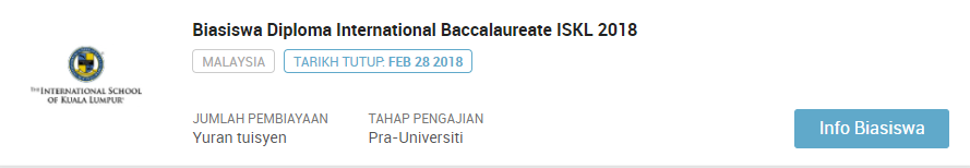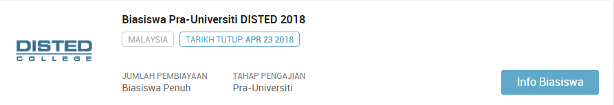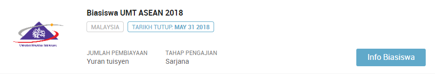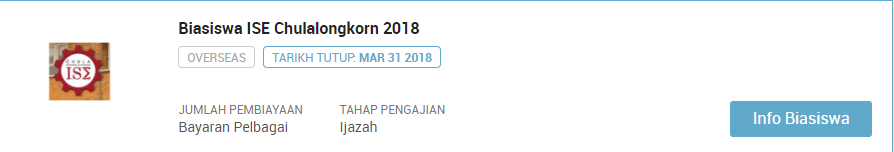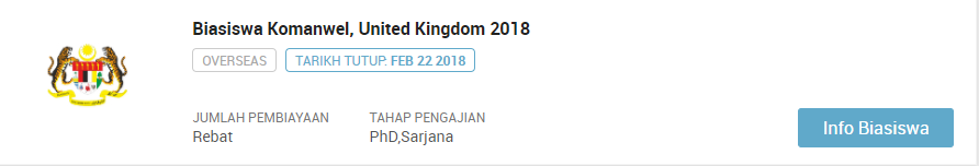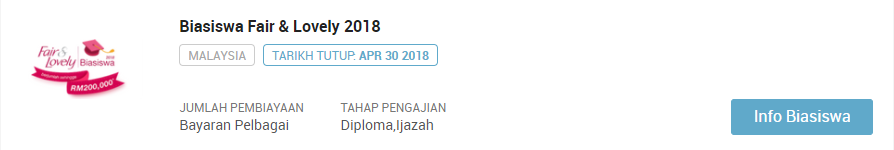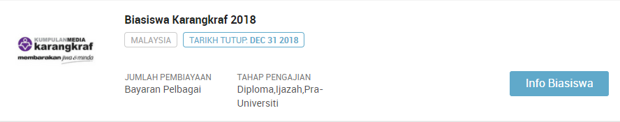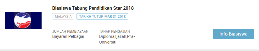 PERHATIAN : Sila klik pautan berikut jika ingin sentiasa mendapatkan kemaskini terkini mengenai info biasiswa terbaru dari masa ke semasa : SENARAI KESELURUHAN BIASISWA TERKINI SEPANJANG TAHUN 2018. Selain artikel ini anda dinasihatkan untuk terus ke laman biasiswa afterschool di link berikut : https://afterschool.my/bm/biasiswa.