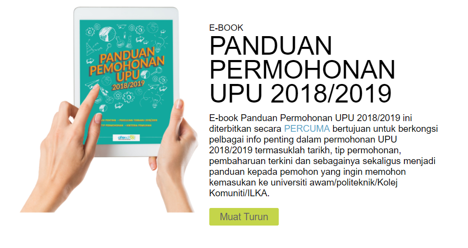 Kepada pemohon UPU 2018/2019, anda dinasihatkan untuk memuat turun e-book Panduan Permohonan UPU secara PERCUMA yang dikongsikan oleh kami. E-book ini mengandungi pelbagai tip yang dapat membantu anda membuat permohonan tanpa melakukan sebarang kesilapan. Untuk anda yang ingin memuat turun, sila klik MUAT TURUN pada gambar dibawah. Semoga berjaya!